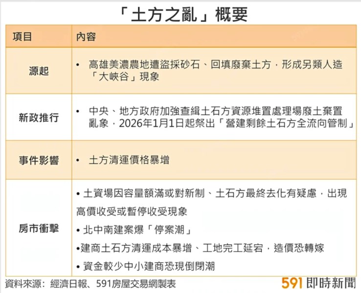 |合法土石方處理場不足 根據《經濟日報》報導, 高雄市美濃區多處農地及國有地遭盜採土石後回填營建廢棄物, 留下至少4大坑洞宛如「大峽谷」。 這起涉及非法挖土、廢棄物回填、土地權責與環境復育等 多重問題的「美濃大峽谷盜採」爭議,不但牽動司法偵辦, 政策落實與制度漏洞,而隨著今年1月1日起上路的「土方清運新制」, 已在近月造成全台各地土方清運大塞車、價格暴漲, 這把火更已從南台灣燒到全國爆出「停案潮」。