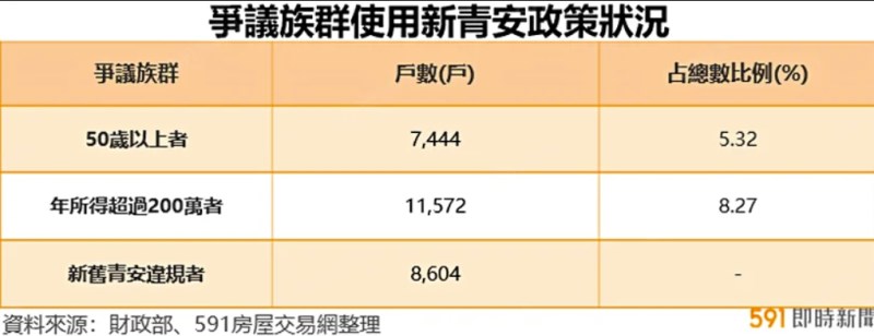|50歲以上逾7千戶 高所得者更逾1萬戶 根據《工商時報》報導,立法院財政委員會中有立委指出, 依財政部清查新青安方案狀況統計資料, 顯示超過50歲以上的族群逾7,000戶、占總數比約5%; 而年所得超過200萬元的高所得者更有1萬多戶、占比8.27%, 雖比例不高,但有如此多的高所得者透過新青安獲得貸款利息補貼並不合理。 此外,新舊青安違規案超過8,000件, 當中許多並非有購屋需求、而是當人頭, 所獲得的利息補貼規模亦達到1.8億元。